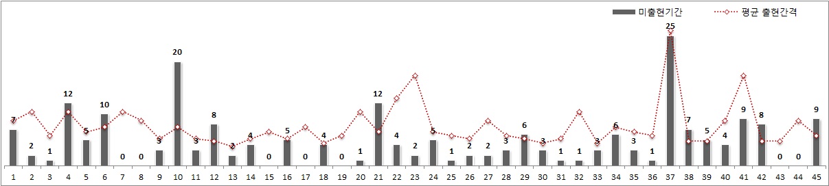 미출현 간격으로 보면 10회이상 미출현했던 번호가 3개나 출현했네요. 15번, 18번, 7번.
