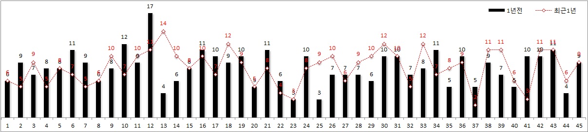 § 최근 1년 번호별 출현간격 및 미출현간격