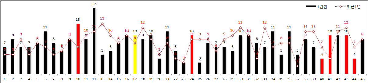 빨간색 기둥은 최근 출현번호이며, 노랑색 기둥은 보너스 번호 입니다.