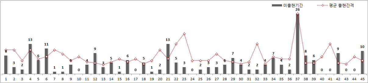 10번.. 한번 터지면 무섭게 나오는 숫자입니다. 1년전 13회 출현한 걸 보시면 아시겠죠?.. 40번대에서 이렇게 터질줄이야.. 정말 대단하네요. 나머지 번호들도 잘 보시고~ 참고하시기 바라며, 다음 회차 번호 분석에서는 아마 아래 그래프<평균출현간격 및 미출현기간>를 참고하시는게 더 좋을 듯 합니다.