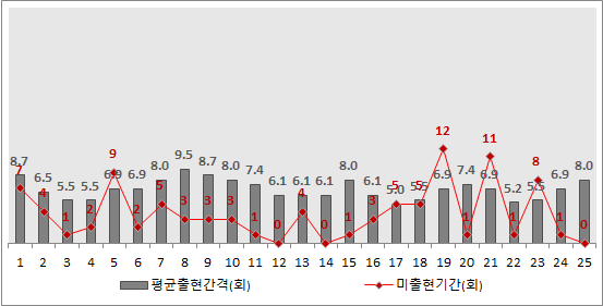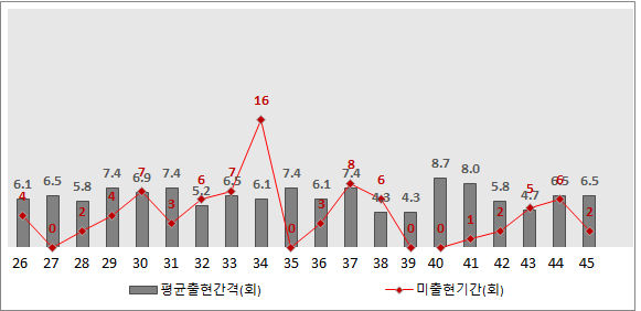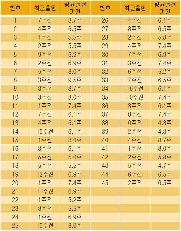 14번, 25번, 35번의 경우는 약 10주전, 두달 반만에 출현하였고, 27번의경우는 2달전에 출현하고 나타났다. 대체적으로 이번 당첨번호는 출현이 뜸했던 번호가 대세였음을 확인할 수있다.