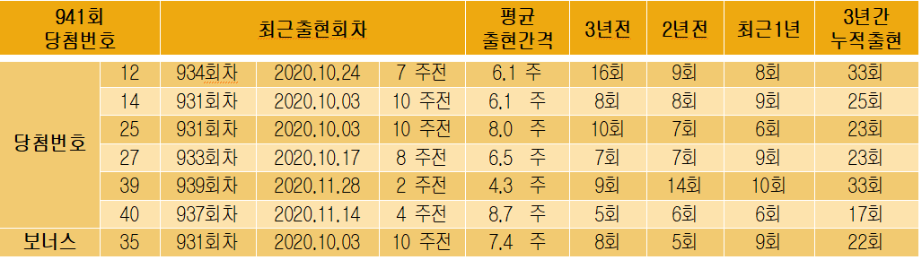 941회차 당첨번호를 보면, 지난 주 941회 행운번호 22개 중 5개의 번호가 출현 하였다. 그리고 최근 출현한적 없는 번호들이 대거 출현하면서 로또 분석하는 곳에서 많은 당첨자를 배출하였을 것으로 판단한다.(평균 출현간격과, 출현한 번호가 큰 오차를 보이지 않았다)