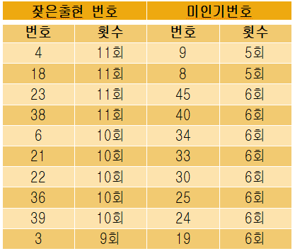 최근 1년 간(52주) 가장 핫했던 번호와 가장 저조했던 번호는 아래와 같다.