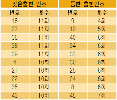 이제 최근 1년간 가장 핫한 번호와 핫하지 않은 번호를 살펴보겠습니다.
