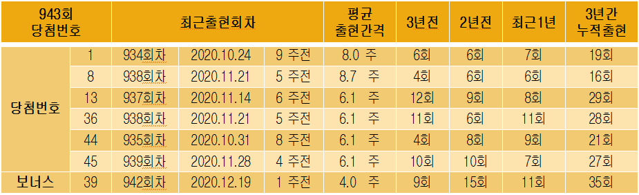 위와 같이 943회 당첨번호 속성을 보면 보너스 번호가 39번으로 동일하게 보너스 번호로 출현하였고, 나머지는 최소 한달에서 두달가량, 전반적으로 평균 출현간격과 유사하게 출현하였습니다(이렇게 출현하는 것 자체가 데이터를 더욱 믿게하네요)