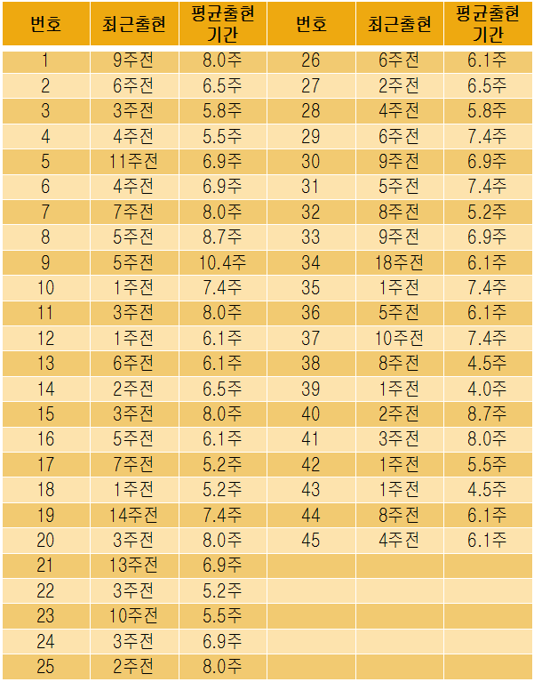 뜸한 출현번호 10개를 보면 지난주와 동일하게 단 한개도 출현하지 않았음을 볼수가 있네요~! 해당 번호들도 참고부탁드리며 다음회차는 아마 뜸한 번호쪽에서 1개정도의 숫자가 나오지 않을까 조심스레 점쳐봅니다.