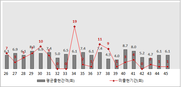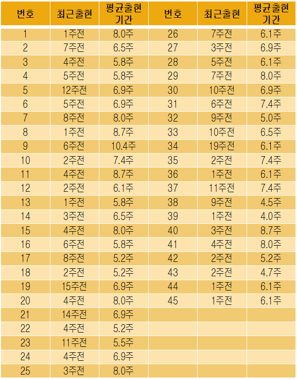 전체 번호별 출현빈도를 그래프로 보면 각 번호대별 출현간격, 그리고 출현하지 않는 기간을 볼 수 있겠습니다.