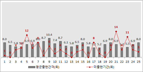 5번, 21번, 30번, 34번, 37번, 38번은 3달 정도 출현하지 않았음.