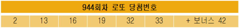 로또 944회차 당첨번호는 2, 13, 16, 19, 32, 33 그리고 보너스 번호 42번 입니다. 지난 943회차 보다 약 2배 많은 자동7명, 수동 6명이 배출되었습니다. 당첨되신 모든 분들 축하드립니다. 이번회차! 서울에서 총3명의 1등 당첨자가 나왔고, 마포구에서 2명(수동1, 자동1), 송파구에서 1명(자동1)이 당첨되었습니다. 이어 부산 1명, 인천 1명, 경기광주, 경기 시흥, 경기 안산, 경시안성, 경기 용인, 경기 평택 2명, 총남 아산 이렇게 수도권 주위에서만 1등이 나왔네요~! 1등 당첨금액은 세전 19.6억정도입니다.