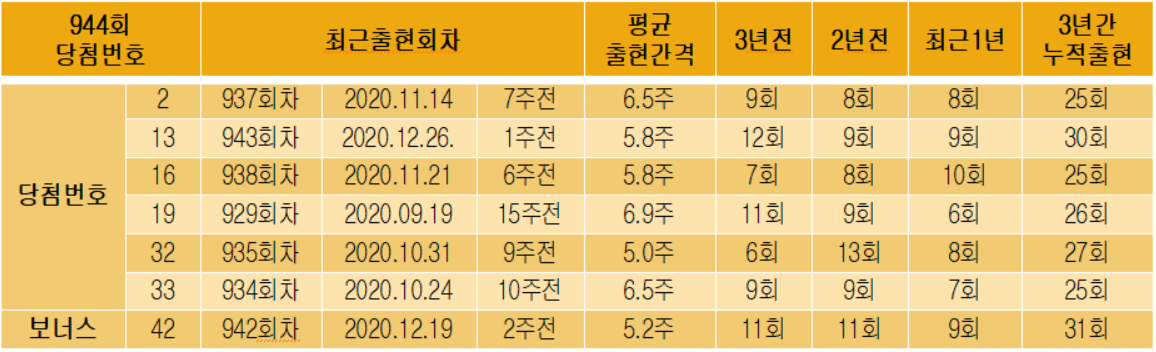 위와 같이 944회 당첨번호를 보면 13번이 지난 주에이어 동일한 번호가 출현하였고 평균 출현간격이 한달 간격으로 매우 인기있는 숫사입니다. 최근 1년 12회나 출현하였고, 3년간의 출현빈도를 보아도 평균 한달간격으로 출현하고 있네요. 19번은 약 4달만에 출현하였고, 33번은 두달 반만에 모습을 보였네요. 지난 분석과 동일하게 20번대는 거의 죽음입니다.앞쪽과 뒷쪽에서 인기있는 번호, 그리고 출현이 뜸했던 번호들이 골고루 섞여나와 많은 당첨자가 배출된 듯하네요.