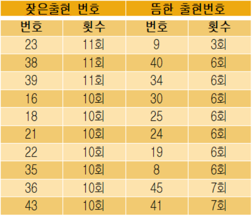 지난 주 뜸했던 번호에서 2개가 출현했네요(19번, 33번). 그리고 잦은 출현번호는 한개도 출현하지 않았네요. 다음 주는 아마도 핫한번호! 아니면 뜸한번호에서 우르르 나올 확률이 많을 것 같습니다!