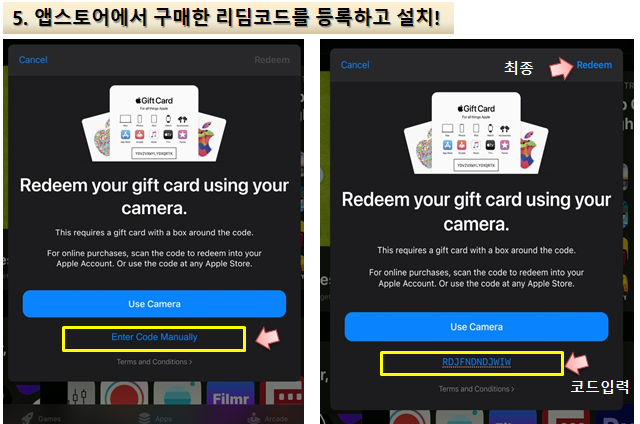 앱스토어(애플)에서 사용하는 일종의 상품권(Gift Code)을 말하며, 주로 유료 앱을 무료로 다운 받을 수 있도록 제공하는 코드로 숫자와 영어 알파벳의 조합으로 만들어진 쿠폰이다. 미국에서 사용자들이 리딤코드를 구매하는 이유는 계정과 연동하는 신용카드를 굳이 만들지 않아도 되기 때문이다. 그렇기 때문에 신용카드가 없는 청소년, 해외결재 카드가 없는 이용자는 리딤코드를 구매해서 이를 통해 유료게임, 앱 등을 구매한다.