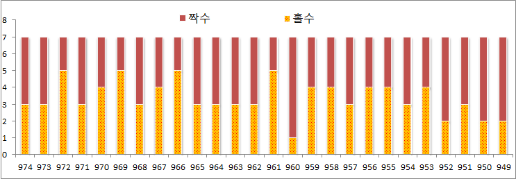 최근 흐름을 볼 떄, 홀수와 짝수의 비율은 대동소이 하지만, 그래도 우열을 가리자면 홀수의 비율이 짝수보다는 더 높은 것을 볼수 있습니다.