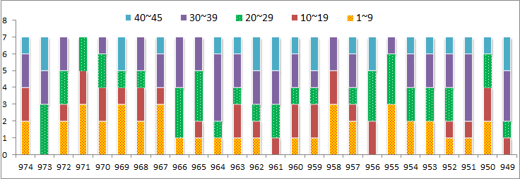 1번과 2번은 최근 10주간의 자료를 분석해보았을 때, 꾸준히 출몰하고 있었네요. 다만 973회차에 잠시 쉬긴하였으나 974회차에 어김없이 두개의 번호가 출현하였네요. 1번의 1년간 평균 출현간격은 약 6주였고, 이번에도 약 6주만에 나왔습니다. 2번 또한 평균 출현간격은 6주이긴하나 구간대의 흐름을 이어가다보니 3주만에 재출현해주었습니다.