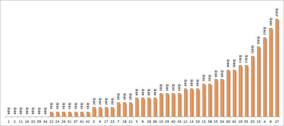 40번~45번 : 40번대는 최근 두달간 참 저조합니다. 구간번호가 6개밖에 되지 않는 점도 있지만, 흐름을 보아서는 무난하게 1개정도 출현 예상됩니다.