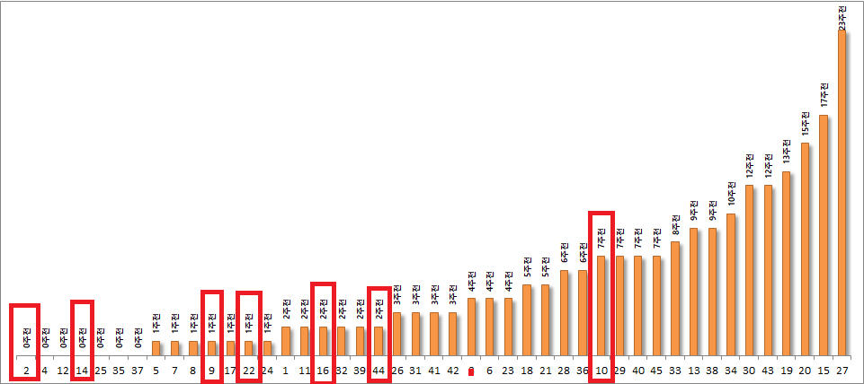 하였으나 44번일줄은 몰랐네요 ㅠ. 43번에 혈안이 되어서.. 사람이 참 어디에 꽂히면 단점보다는 장점만 보이기 마련입니다. 구간의 흐름으로만 보았을 때 다음회차는 특정구간에서 번호가 돋보일 것으로 예상됩니다.
