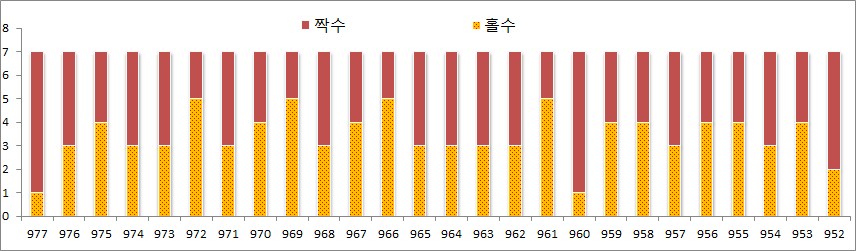 위 차트에서 보듯이 짝수의 흐름이 점점 높아지더니 결국 952회차에 짝수만 6개가 출현하였습니다. 한번 크게 짝수출현이 있고난 다음은 홀수가 우위를 차지하는 모습을 볼 수 있죠?, 978회차는 홀수(5), 짝수(2)를 조심스레 예상해봅니다.