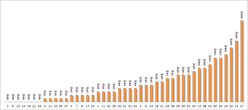 다음 회차(978회차)에도 인기번호들이 출현할지, 아니면 골고루 출현할지, 여지껏 나오지 않은 27번이 출현할지 나와봐야 알겠지만, 이러한 흐름속에서 27번이 나올확률은 극히 드뭅니다. 오히려 적정한 선에서 번호들이 출현할 가능성이 높으며(평균 8~9주 출현간격의 번호들), 최근 출현한 번호들(약2주 이내)로 구성한다면 당첨확률이 많이 높아질 수 있을 것으로 예상됩니다.