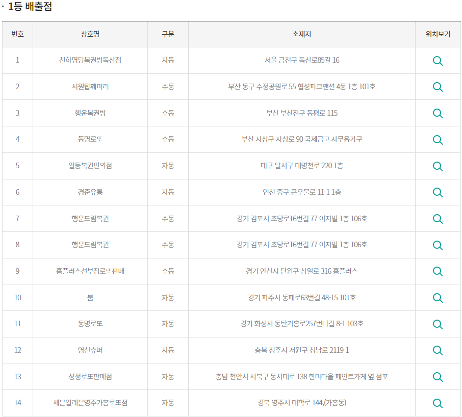 이번회차! 지지난회차(경상도 창원이였죠?)와 비슷하게 수동으로 2게임 당첨자를 배출한 가게가 나왔네요. 행운드림복권(경기 김포시 초당로 16번길 이지빌 1층 106호)에서 동일한 사람이 수동으로 2게임을 진행한 것 같죠?ㅎㅎ