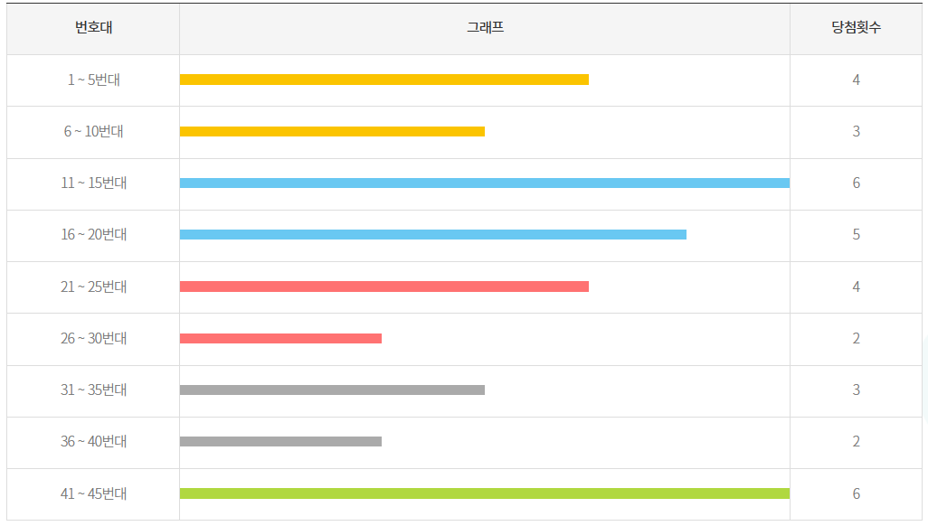 아래 표를 보시면 최근 5주간 41~45번대, 11~15번대에서 많은 당첨번호가 나오고 있는 것을 확인할 수 있습니다. 이번 회차 당첨번호도 이 구간에서 총 3개의 당첨번호가 나왔습니다. 다음 회차에서도 이 구간에서 구간별로 몇 개의 번호가 나올지 궁금해집니다.