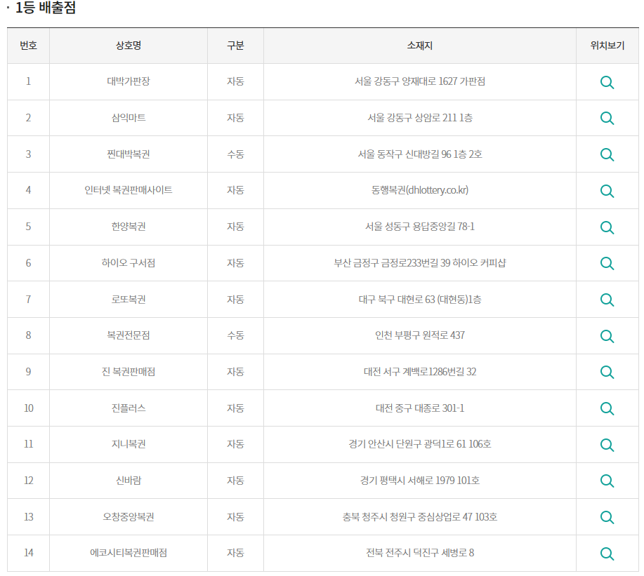 로또 1등 판매점들을 보니 서울에서만 4곳에서 나왔네요. 경기도와 대전에서는 2곳, 그 외 부산, 대구, 인천, 대전, 충북, 전북 각 1곳씩 1등 판매점이 나왔습니다. 인터넷 동행복권 사이트에서도 당첨자가 나왔네요!!