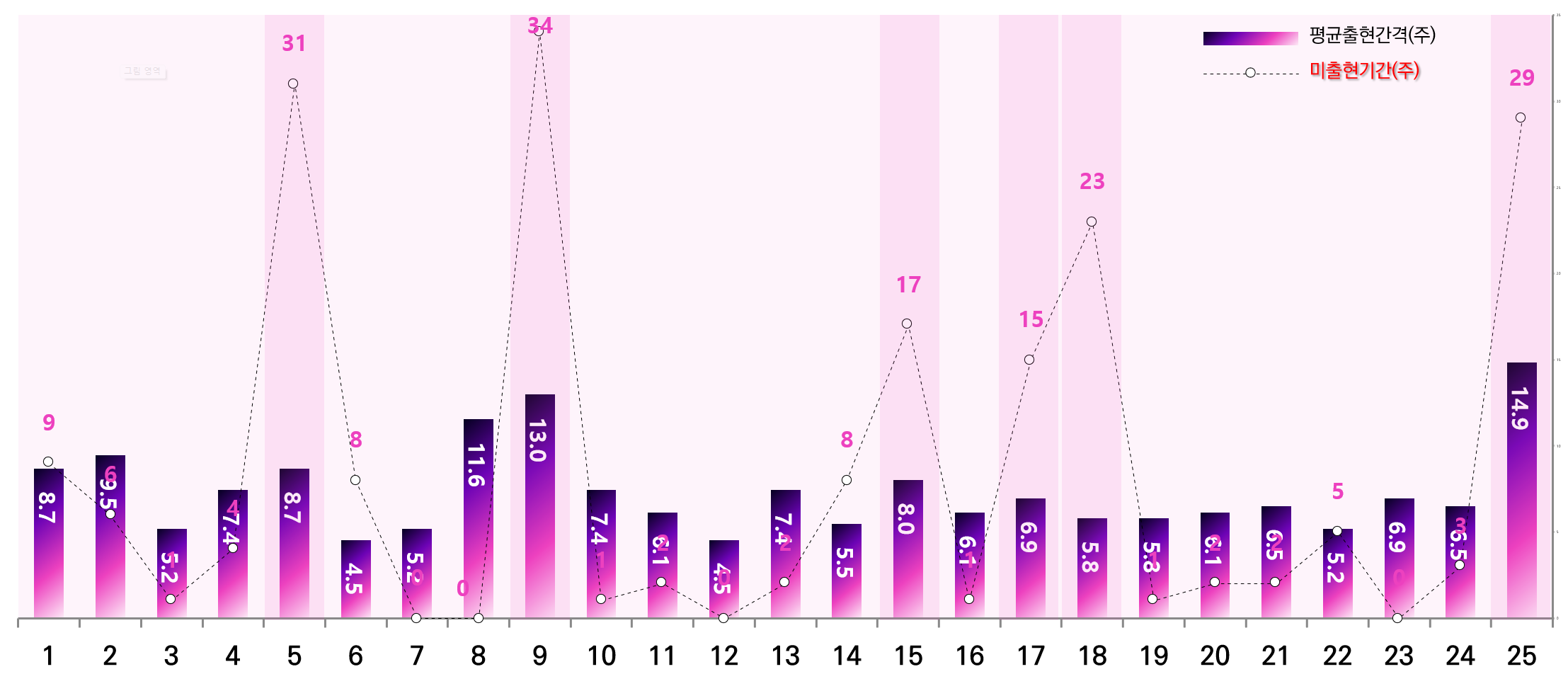 - 막대 차트 : 평균 출현 간격(주)
