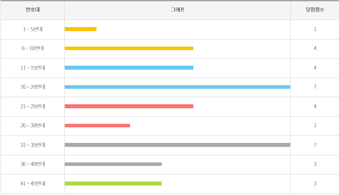 아래 표를 보시면 최근 5주간 16~20번대 및 31~35번대에서 7번, 6~10번대, 11~15번대, 21~25번대에서 4번의 번호 출현횟수가 나타나고 있습니다. 유독 2구간에서만 7번이나 번호가 출현했네요. 이번 회차에서는 쏠림현상(?)처럼 한 번호대에서 계속 번호가 나와서 이러한 현상이 나오는 거 같습니다. 다음 회차에는 구간별로 몇 개의 번호가 나올지 매우 궁금해집니다.