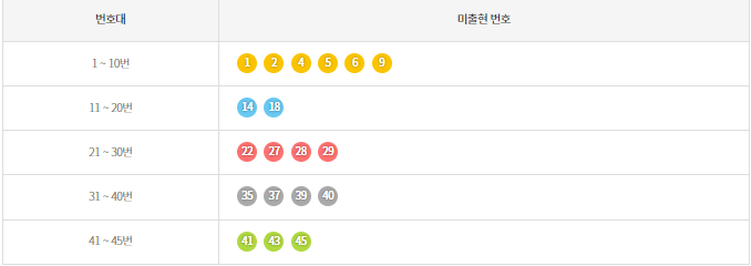 최근 5주간 1~10번, 21~30번, 31~40번대는 5개, 11~20번대는 4개가 당첨번호로 나오지 않았습니다.