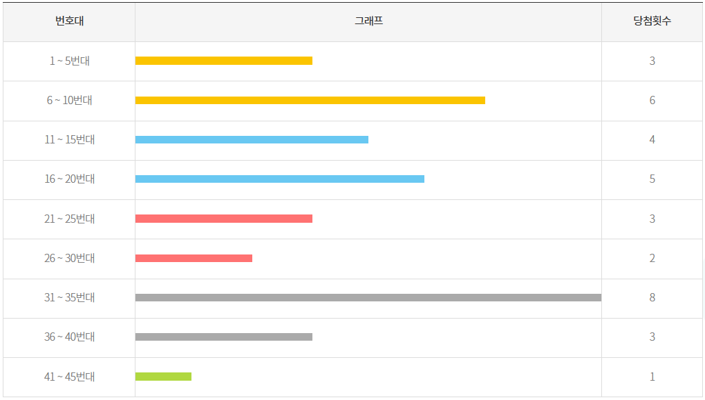 아래 표를 보시면 최근 5주간 31~35번대에서 8번이나 번호가 출현했습니다. 그 다음으로는 6~10번대 구간 6번이구요. 31~35번대가 지속적으로 꾸준히 나오고 있는 것이 매우 신기합니다. 다음주에는 어느 구간에서 몇 개의 번호가 나올지 매우 궁금해집니다.
