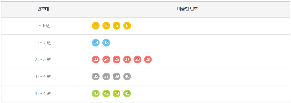 최근 5주간 미출현 번호 구간을 아래에 한 번 알아보도록 하겠습니다.
