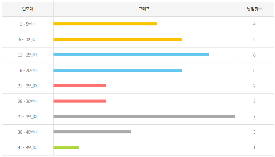 아래 표를 보시면 최근 5주간 31~35번대에서 7번, 11~15번대에서6번의 번호 출현횟수가 나타나고 있습니다. 이번 회차에서는 10번대에서 번호가 쏟아졌죠~ 다음 회차에는 어떤 구간에서 어떠한 숫자들이 나올지 매우 궁금해집니다.