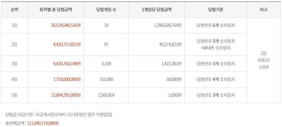 이번 1119회차 로또 당첨금액을 알아보겠습니다. 먼저 1등부터 5등까지 총 당첨금액을 순차적으로 알아보도록 할게요.
