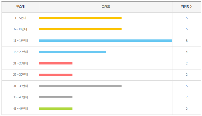 아래 표를 보시면 최근 5주간 11~15번대에서 8번, 1~5,6~10번대 및 31~35번대에서 5번의 번호 출현횟수가 나타나고 있습니다. 이번회차는 전체적으로도 자주 나오던 번호들이 당첨번호로 등장했는데요, 다음 회차에는 구간별로 몇 개의 번호가 나올지 궁금해집니다.