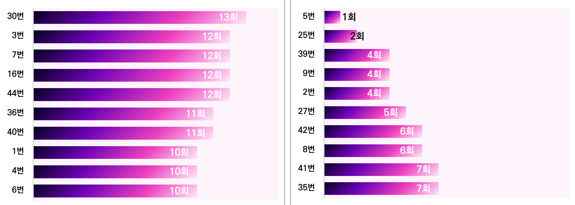 최근 1년 간 가장 많이 출현한 숫자는 30번이고, 가장 출현하지 않았던 숫자는 5번 입니다.