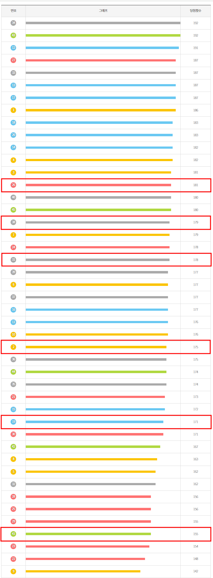 총 45개의 번호 중 각각의 번호는 몇 번째로 당첨횟수가 많은 번호일까요???