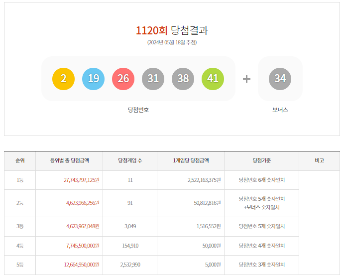 1120회차 로또 당첨번호는 2,19,26,31,38,41 + 34(보너스) 네요!!!